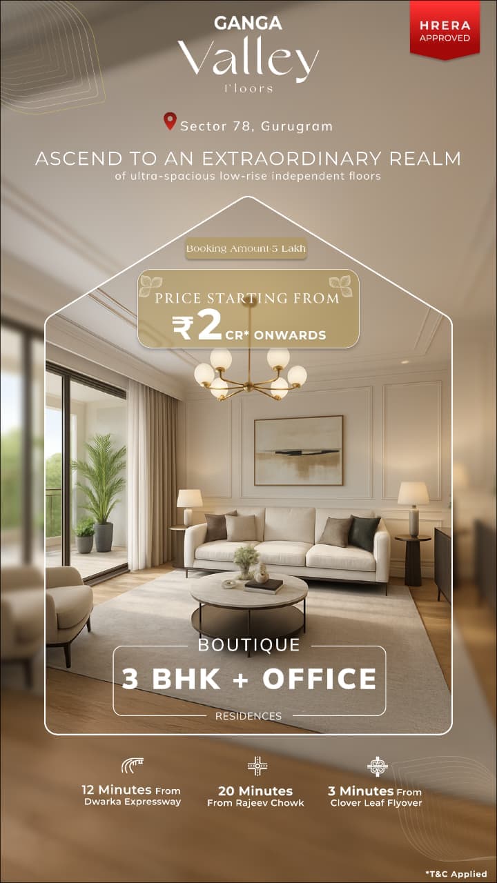 Ganga Valley Sector 78 Gurgaon offers premium 3 BHK luxury builder floors designed for modern, comfortable living in New Gurgaon. Spread across ~5 acres with limited exclusive units, each home features a spacious 1411 sq.ft. layout ideal for families. Prices start from ₹2.30 Cr.